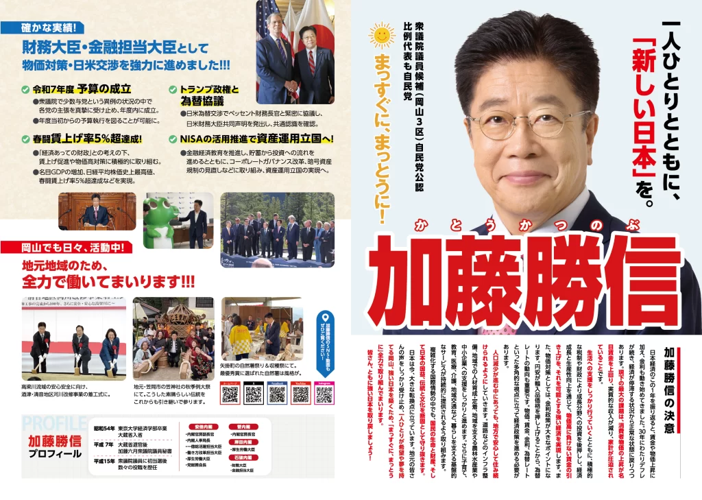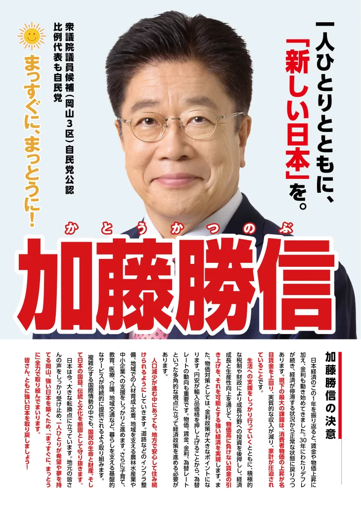 日本は今、大きな転換点に立っています。地元の皆さんの声をしっかり受け止め、一人ひとりが希望や夢を持てる岡山、強い日本を築くため、「まっすぐに、まっとうに」全力で取り組んでまいります。