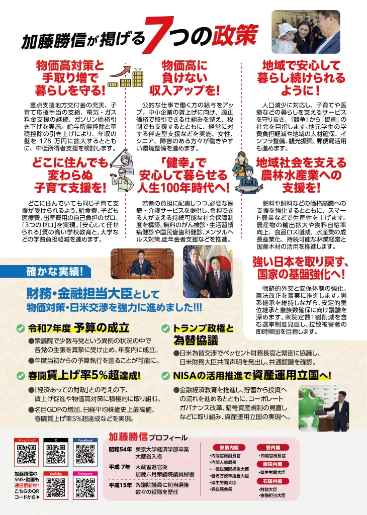 人口減少が進む中にあっても、地方で安心して住み続けられるようにしていきます。道路などのインフラ整備、地域での人材育成・定着、地域を支える農林水産業や中小企業への支援をしっかりと進めます。さらに子育て、教育、医療、介護、地域交通など、暮らしを支える基盤的なサービスが持続的に提供されるよう取り組みます。複雑化する国際情勢の中でも、国民の生命と財産、そして日本の国益、伝統と文化を断固として守り抜きます。